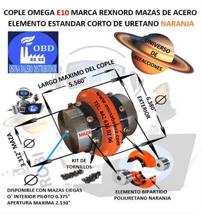 ENVIO GRATIS, ENVIO INMEDIATO DESPUES DE CONFIRMAR EL PAGO DEL PRODUCTO. DIMENSIONES: EXTERIOR 6 3/8”  LARGO 5 9/16”  MAZA 3 5/16”  ACOPLAMIENTO COMPLETO REXNORD OMEGA INCLUYE 2 MAZAS NO. 10 SHRB Y E10 ELEMENTO ELASTOMERICO FLEXIBLE NARANJA CON KIT DE TORNILLOS, EQUIVALENTE TB WOOD´S WE10, MAZA WE10H, FALK E-10, Ver Ficha Técnica Aquí