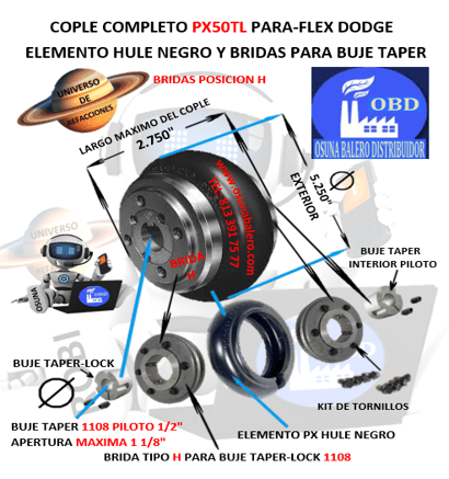 ENVIO GRATIS, ENVIO INMEDIATO DESPUES DE CONFIRMAR EL PAGO DEL PRODUCTO. DIMENSIONES: EXTERIOR 5.250”  LARGO 2.750” EL COPLE COMPLETO INCLUYE 2 BRIDAS PARA BUJE TAPER LOCK N.P 010601 Y 2 BUES 1108 N.P. 119365 Y ELEMENTO TIPO LLANTA FLEXIBLE NP. 011105 EQUIVALENTES:  MARTIN F50, HABIX, OPTIBELT D50, ABB DODGE PX-50 PARA FLEX, Ver Ficha Técnica Aquí