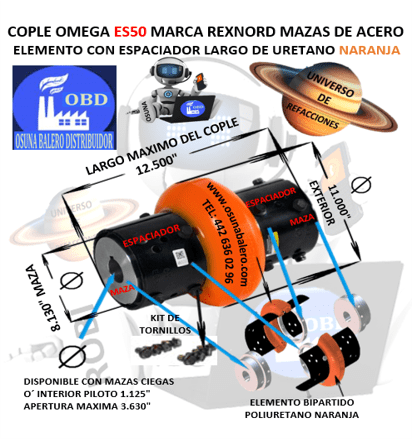 ENVIO GRATIS, ENVIO 24 A 48 HRS. DESPUES DE CONFIRMAR EL PAGO DEL PRODUCTO. DIMENSIONES: EXTERIOR 11”  LARGO 12 1/2”  MAZA 8.130”  ACOPLAMIENTO COMPLETO REXNORD OMEGA INCLUYE  MAZAS NO. 50 SHRB Y E50 ELEMENTO ELASTOMERICO FLEXIBLE NARANJA CON KIT DE TORNILLOS, EQUIVALENTE TB WOODS WES50, MAZA WE50H, FALK ES-50 COUPLING COMPLETE WITH SPACER, Ver Ficha Técnica Aquí
