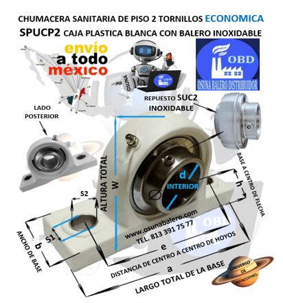 COD. S2/QC4 ENVIO INMEDIATO. DIMENSIONES: FLECHA d=1 15/16” h= 2 1/4” e= 6-1/4” a= 8-1/8” b= 2 3/8” CHUMACERA DE PISO 2 TORNILLOS CAJA PLASTICA BLANCA PARA INDUSTRIA ALIMENTICIA CON RODAMIENTO ACERO INOXIDABLE, EQUIVALENTE: SKF SYWK 1 15/16 YTH, DODGE 127508 P2B-SCEZ-115-PCR, ECO S-UCPPL210-31W, OBD SPUCP-210-31, TRANSLINK UCPP-210-31, ECO SUCPPL210-31, Ver Ficha Técnica Aquí