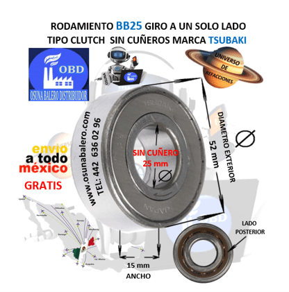 ENVIO GRATIS, ENVIO INMEDIATO DESPUES DE CONFIRMAR EL PAGO DEL PRODUCTO. DIMENSIONES INTERIOR =25mm  EXTERIOR =52mm ANCHO =15mm  EQUIVALENTE: GMN FK-6205, MORSE KK-25, TSUBAKI BB-25, Formsprag USA CSK25, Marland CSK-25, Renold REUK25-2RS, Ringspann ZZ6205, Stieber CSK25-2RS, FREEWHEEL, Ver Ficha Técnica Aquí