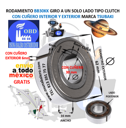 ENVIO GRATIS, ENVIO INMEDIATO DESPUES DE CONFIRMAR EL PAGO DEL PRODUCTO. DIMENSIONES d=30mm  D=62mm B=16mm  EQUIVALENTE: GMN FKNN-6206, MORSE KK-30-K2, TSUBAKI BB-30-KK, STIEBER CSK-30-PP, Ver Ficha Técnica Aquí