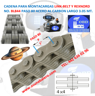 ENVIO INMEDIATO, CAJA 3.05 Mts ( 10FT. ) CADENA 80 4 X 4 LINK BELT BL-844 MONTACARGA EQUIVALENTE MORSE, TSUBAKI,REXNORD,TRANSLINK BL-844, ISO NO. LH1644, Ver Ficha Técnica Aquí