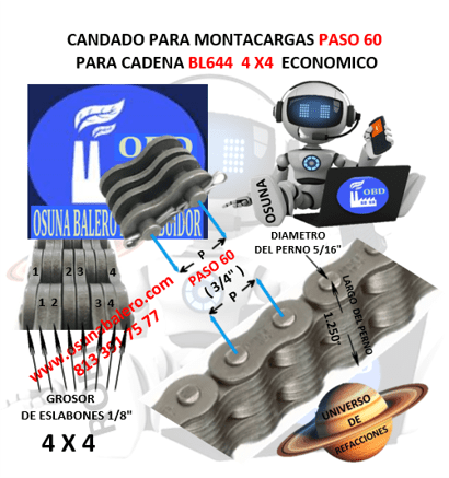 COD. S10/QH7 ENVIO INMEDIATO. PARA CADENA 60   4 ESLABONES X 4 ESLABONES PARA MONTACARGAS EQUIVALENTE: MORSE, TSUBAKI, REXNORD, TRANSLINK, LINK-BELT, CABL-644, CLBL 644,