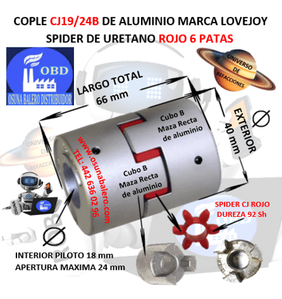 CJ19/24B COPLE LOVEJOY DE ALUMINIO MAZAS RECTAS EXTERIOR 40mm LARGO 66mm CON SPIDER CJ19 DUREZA 98A ROJO NO. PARTE 68514471442