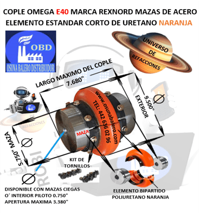 ENVIO GRATIS, ENVIO INMEDIATO DESPUES DE CONFIRMAR EL PAGO DEL PRODUCTO. DIMENSIONES: EXTERIOR 9 1/2”  LARGO 7 11/16”  MAZA 5 3/4” ACOPLAMIENTO COMPLETO REXNORD OMEGA INCLUYE  MAZAS NO.  40 SHRB Y E40 ELEMENTO ELASTOMERICO FLEXIBLE NARANJA CON KIT DE TORNILLOS, EQUIVALENTE TB WOODS WE40, MAZA WE40H, FALK E-40, Ver Ficha Técnica Aquí