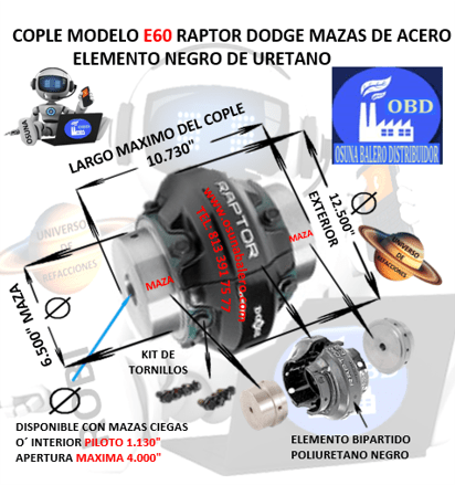 ENVIO GRATIS, ENVIO 24 A 48 HRS. DESPUES DE CONFIRMAR EL PAGO DEL PRODUCTO. DIMENSIONES: EXTERIOR 12.500” LARGO 10.130”  MAZA 6.500” INCLUYE: 1 ELEMENTO DE POLIURETANO NEGRO CON KIT DE TORNILLOS NO. PARTE 015852 Y 2 MAZAS NO. PARTE 015243 BARRENO PILOTO, EQUIVALENTE: OMEGA REXNOR E60, TB WOOD´S DURA-FLEX WE60, Ver Ficha Técnica Aquí