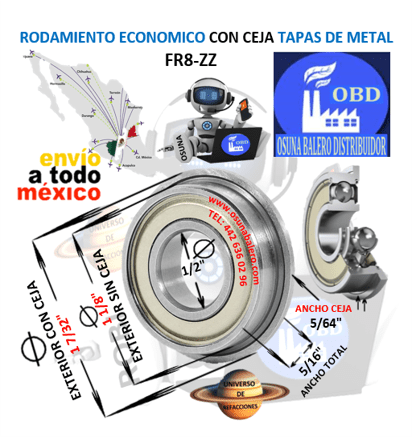 COD. S13/QC3 ENVIO INMEDIATO, DIMENSIONES: INTERIOR = 1/2” EXTERIOR = 1 1/8” AANCHO = 5/16”   EXTERIOR CON CEJA 1 7/32” RODAMIENTOS-R SERIE R EQUIVALENTE: SAPORO DDFR-8-ZZ, FR-8-ZZ, FR8ZZ, ECONOMIC OBD ACT. MEXICO 2026