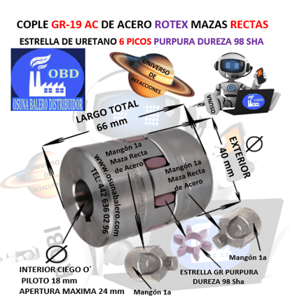 GR-19 AC COPLE ROTEX DE ACERO MAZAS RECTAS (1a) EXTERIOR 40mm LARGO 66mm ESTRELLA GR-19 DUREZA 98a PURPURA