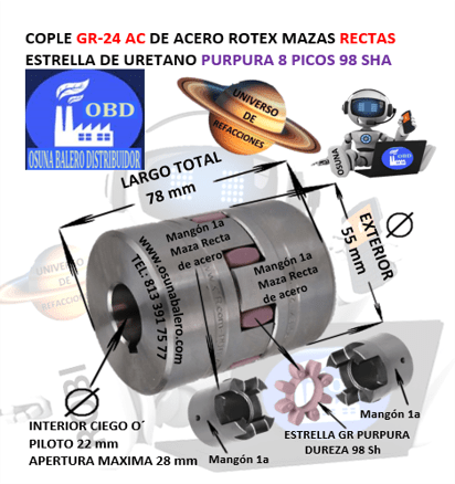 GR-24 AC COPLE ROTEX ( KTR ) DE ACERO MAZAS RECTAS (1a) PILOTO CON ESTRELLA 98ShA PURPURA EXTERIOR 55mm LARGO 78mm