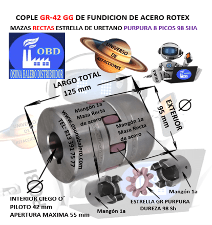 GR-42 COPLE ROTEX ( KTR ) DE FIERRO (GG) MAZAS RECTAS (1a) PILOTO CON SPIDER 98ShA PURPURA EXTERIOR 95mm LARGO 126mm
