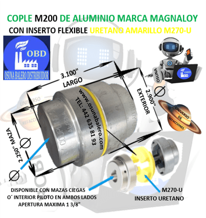 COD. S1/QE4 ENVIO GRATIS, ENVIO INMEDIATO DESPUES DE CONFIRMAR SU PAGO. COPLE MAGNALOY M-200-U DIAMETRO EXTERIOR 2.900” LARGO 3.100” ACOPLAMIETO COMPLETO INCLUYE ELEMENTO URETANO AMARILLO M270-U Y 2 MAZAS ( MAZAS DISPONIBLES CIEGAS Y BARRENO PILOTO ) Premium Flexible Drive Couplings M 200 U + M-270-U, Ver Ficha Técnica Aquí