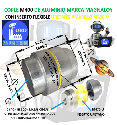 COD. S1/QE4 ENVIO GRATIS, ENVIO INMEDIATO DESPUES DE CONFIRMAR SU PAGO. COPLE MAGNALOY M-400U DIAMETRO EXTERIOR 3.980” LARGO 4.240”  ACOPLAMIENTO COMPLETO INCLUYE ELEMENTO INTERNO URETANO AMARILLO M470U Y 2 MAZAS ( MAZAS DISPONIBLES  CIEGAS Y BARRENO PILOTO )  Premium Flexible Drive Couplings M 400 + M-470-U, Ver Ficha Técnica Aquí