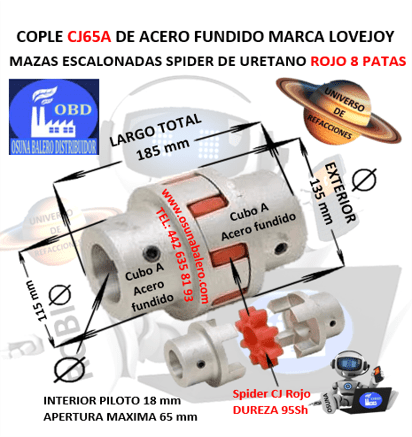 CJ65A COPLE LOVEJOY DE FIERRO MAZAS ESCALONADAS EXTERIOR 135mm LARGO 185mm SPIDER CJ65 DUREZA 95A ROJO NO. PARTE 68514462417