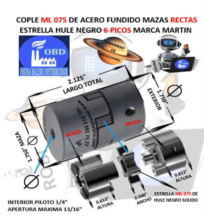 ENVIO INMEDIATO, COPLE ESTRELLA CON ELEMENTO HULE NEOPRENO NEGRO MARTIN SRL 075,  DIAMETRO EXTERIOR = 1  3/4″ LARGO B= 2 1/8″ EQUIVALENTE: MARTIN MS075, ML075 ECONOMICO PRESISA NO. 0.5 REPUESTO HULE ESTRELLA NEOPRENO NEGRO No. 0.75, LOVE JOY L-075, EST L075-SOX, MAZAS DISPONIBLES EN VARIAS MEDIDAS DE INTERIOR, Ver Ficha Técnica Aquí