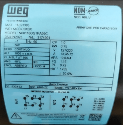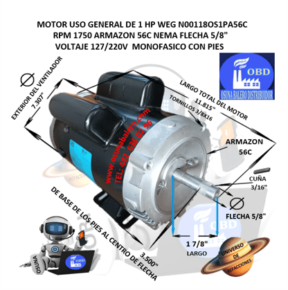 ENVIO GRATIS, ENVIO INMEDIATO DESPUES DE CONFIRMAR EL PAGO DEL PRODUCTO. MOTOR 1HP WEG NEMA 56C FLECHA 5/8 EQUIV: MARATHON JR010 K56AC53F07, 1HP 4P 56 MON,