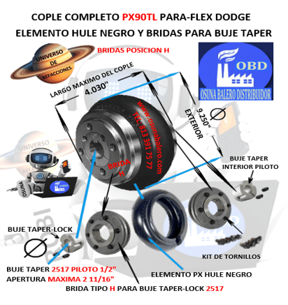 ENVIO GRATIS, ENVIO INMEDIATO DESPUES DE CONFIRMAR EL PAGO DEL PRODUCTO. DIMENSIONES: EXTERIOR 9.250”  LARGO 4.030” EL COPLE COMPLETO INCLUYE 2 BRIDAS PARA BUJE TAPER LOCK N.P 010605 Y 2 BUES 2517 N.P. 119100 Y ELEMENTO TIPO LLANTA FLEXIBLE NP. 011109 EQUIVALENTES:  MARTIN F90, HABIX, OPTIBELT D90, ABB DODGE PX-90 PARA FLEX, Ver Ficha Técnica Aquí