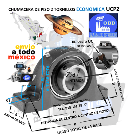 UCP209-28 CHUMACERA ECONOMICA DE PISO d= 1 3/4″ h=2 1/8″ e=5-3/4” b=2-1/8” a=7-15/32”