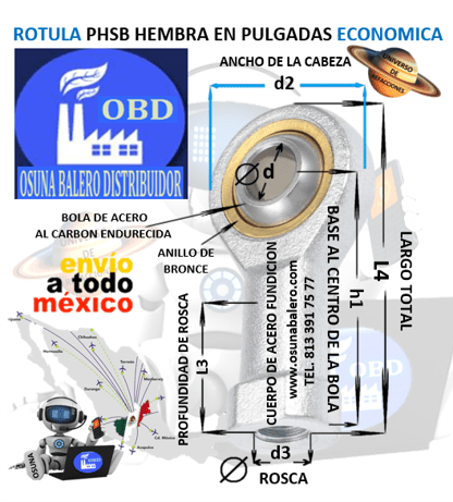 PHSB-16 R ROTULA HEMBRA d=1″ d3=ROSCA 1 1/4-12 DERECHA MARCA ECONOMIC
