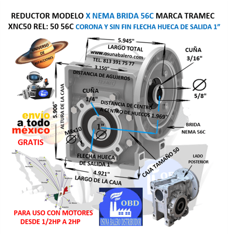 XNC50 50 56C REDUCTOR TRAMEC BRIDA 56C REL 50:1 CORONA Y SIN FIN FLECHA HUECA SALIDA 1”