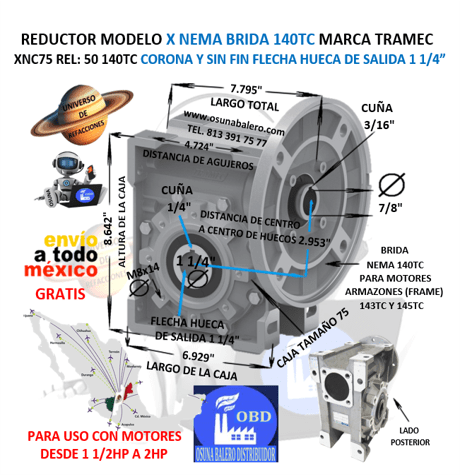 XNC75 50 140TC REDUCTOR TRAMEC BRIDA 140TC REL 50:1 CORONA Y SIN FIN FLECHA HUECA SALIDA 1 1/4”
